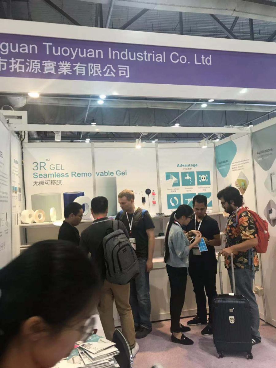 拓源無痕可移膠廠家于2018年10月18-21日參加香港電子展取得圓滿成功。無痕可移膠廠家拓源公司在展會上吸引了不少國內外客戶,得知可移膠的重復使用,可移動,可水洗,無殘無痕的特點后。紛紛要求我們可移膠專家們為自己的產品給出解決方案。提升自己的產品逼格。這次展會的主要針對電子產品,有音箱、VR、移動電源、無線充坐等。